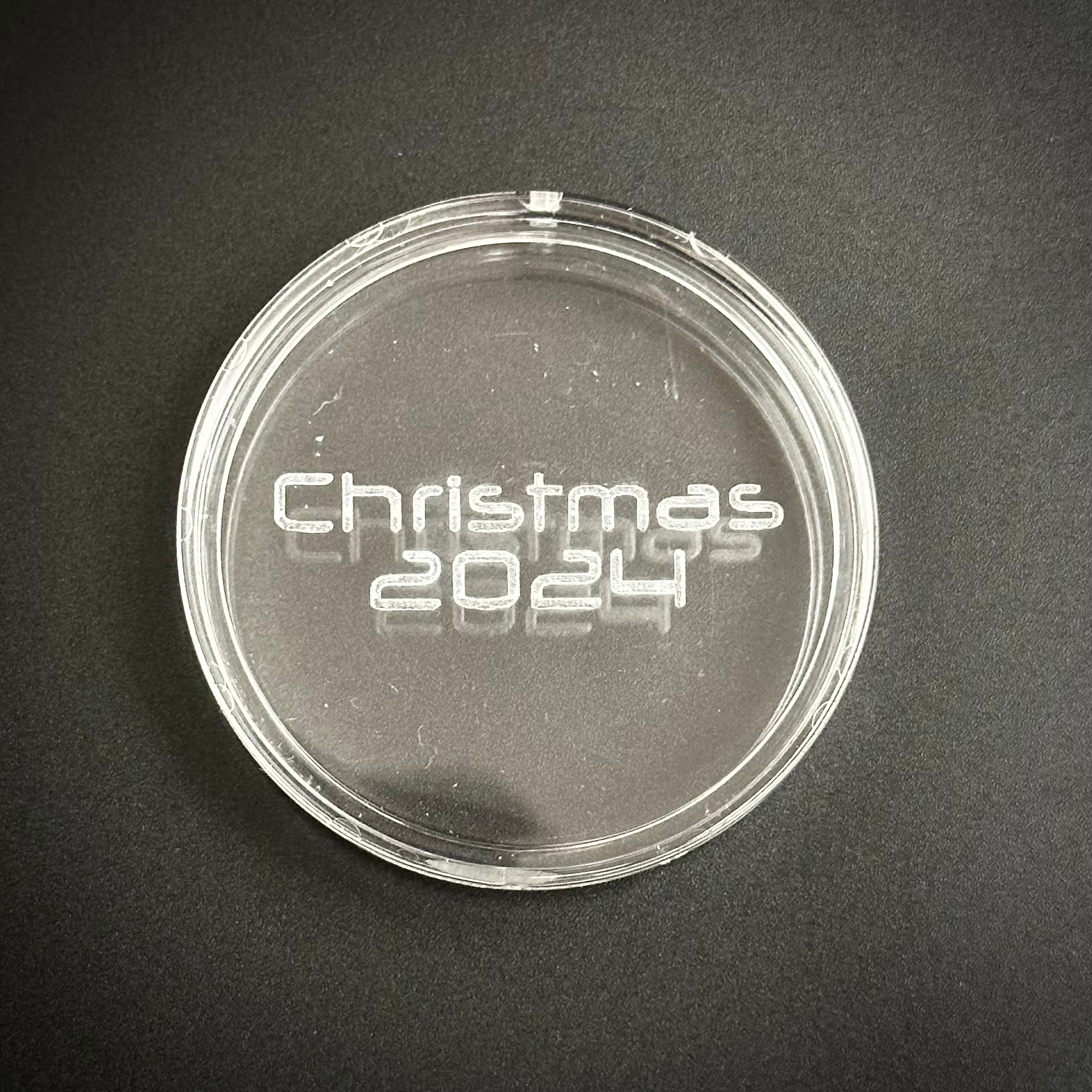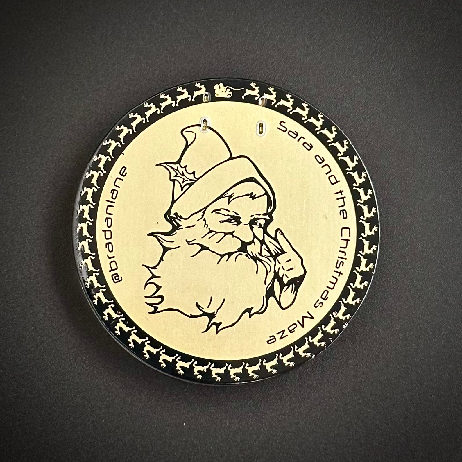 The 2024 Christmas ornament is in the shape of a coin. It comes with a small hook for hanging on a tree and the face is clad in gold! The ornament comes with a text adventure game installed - Sara and the Christmas Maze. The ornament can also be use as a mini macro-pad for your computer.